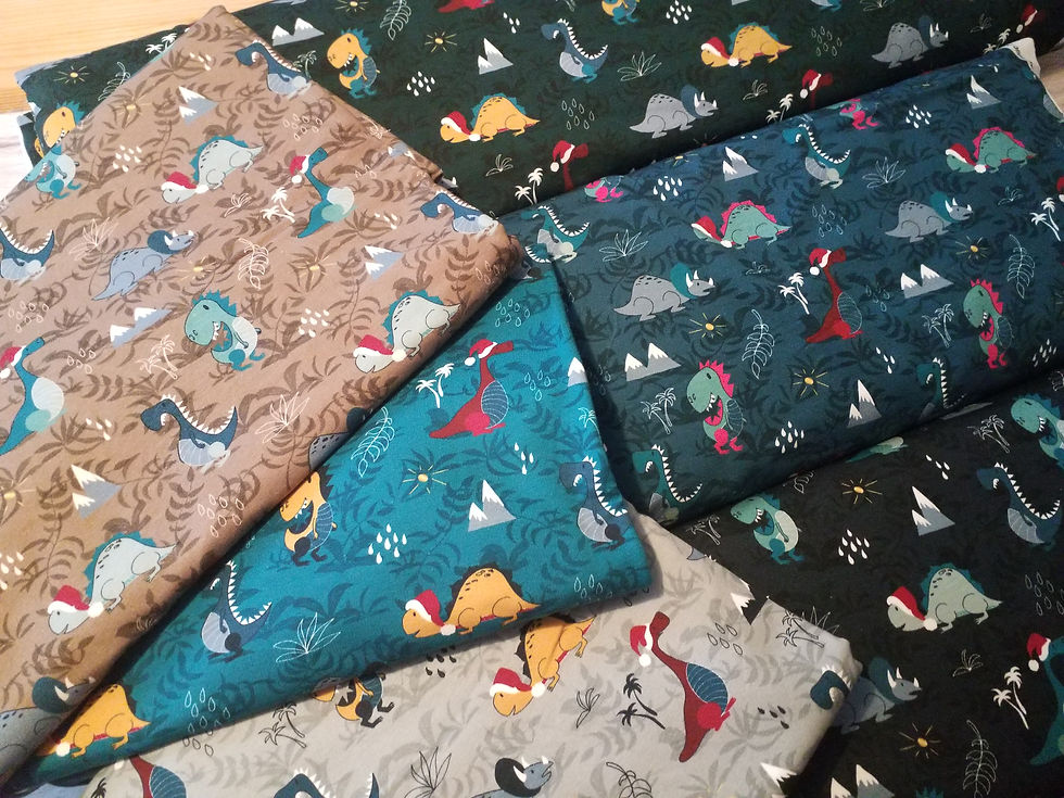 Christmas dinos, jeans/denim backgroun, Brushed Back French Terry, alpine fleece